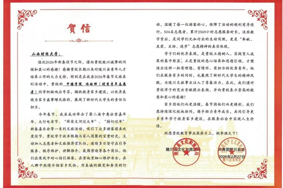 近日,山西财经大学收到来自山西省陵川县的一封贺信,信中高度赞扬了我院2025级中德会计学2班学生冯皓帅,在寒假期间积极投身家乡志愿服务、助力新春文旅系列活动中的优异表现。